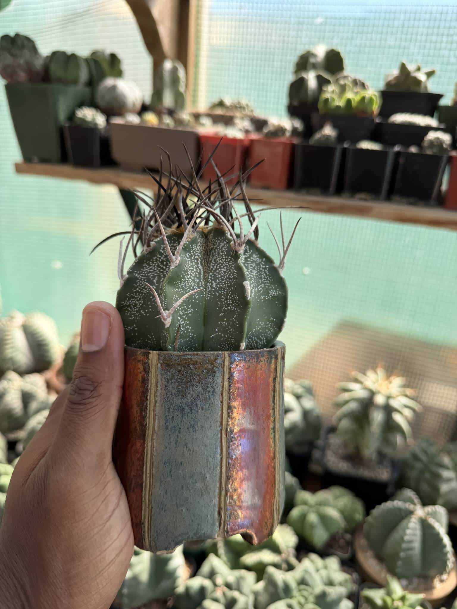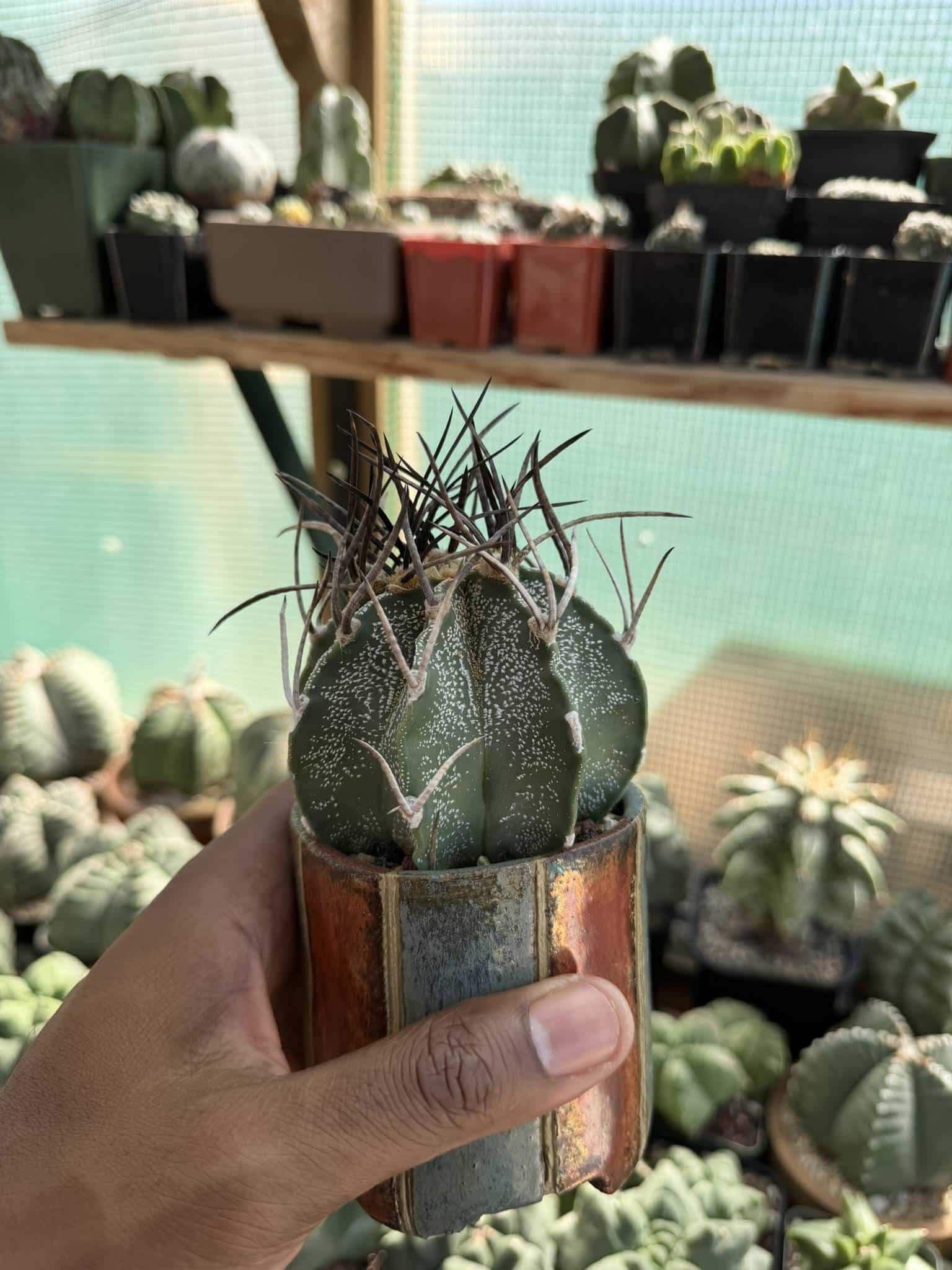 Astrophytum capricorne cv. Taiho-Gyoku Buffalo fully mature and seed grown in a 3 inch custom pot. I call very few things rare but these are often nudum so totally rare to see one with trichomes (white dots).
